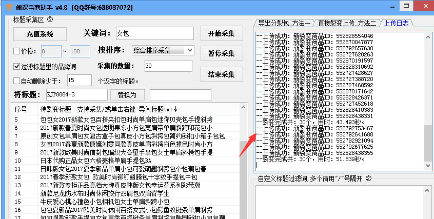 9、输入“关键词”选择“采集的数量”(建议每个商品裂变的数量最多为30),点击“开始采集”,然后筛选标题中的品牌词以及不符合宝贝描述的文字